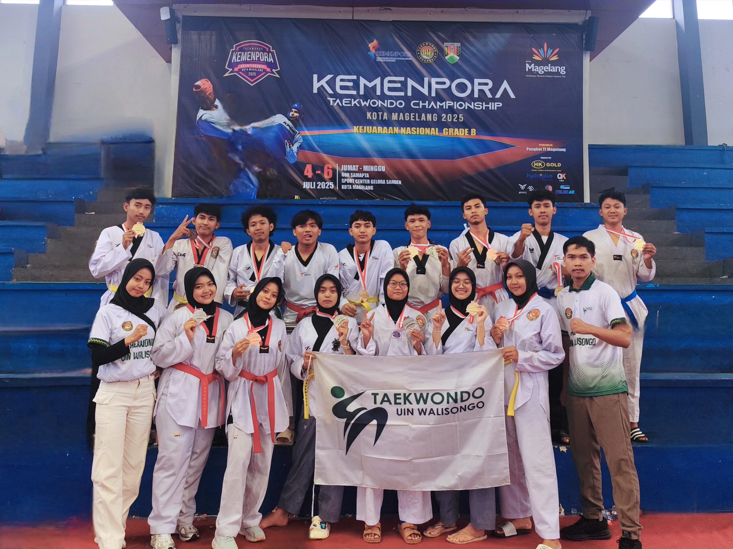 UIN Walisongo Online, Semarang – Prestasi membanggakan kembali ditorehkan mahasiswa Universitas Islam Negeri (UIN) Walisongo Semarang di tingkat nasional. Melalui Unit Kegiatan Mahasiswa (UKM) Taekwondo, sebanyak 15 atlet berhasil membawa pulang 15 medali dalam ajang Kemenpora Taekwondo Championship 2025 yang digelar di GOR Samapta, Kota Magelang, pada 4–6 Juli 2025.