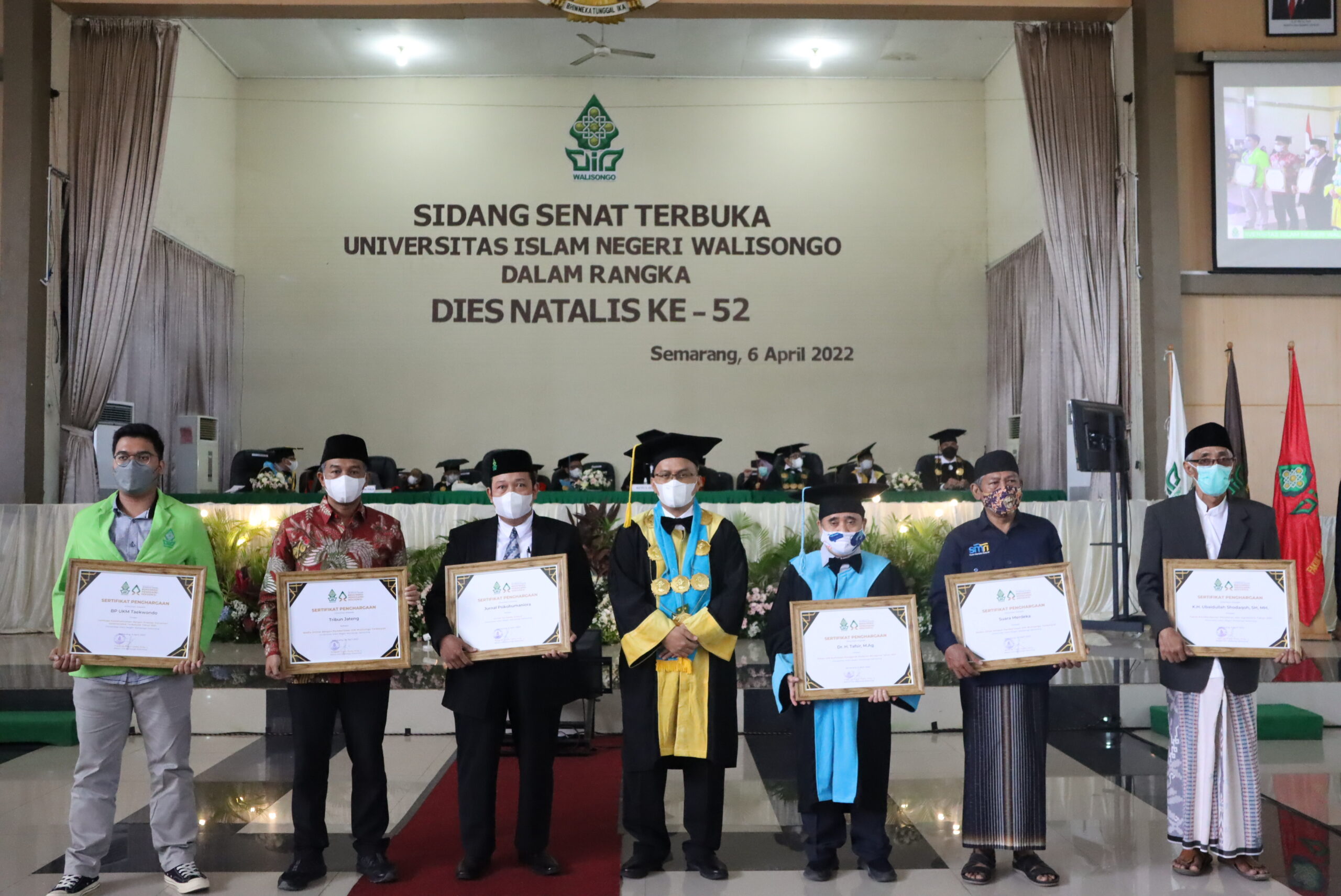 Penghargaan diberikan secara langsung oleh Rektor UIN Walisongo Prof Dr Imam Taufiq, M.Ag. di sela sidang senat terbuka dalam rangka Dies Natalis ke-52 di Auditorium 2 Kampus 3 UIN Walisongo, Rabu, 6 April 2022.